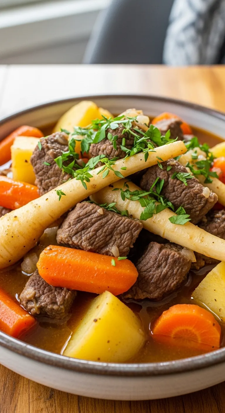 Parsnips were common in traditional Irish cooking when available . They hold up well to long cooking and add a lovely earthy sweetness that balances the richness of the meat. Their texture is slightly different from carrots—softer but not mushy when cooked properly.