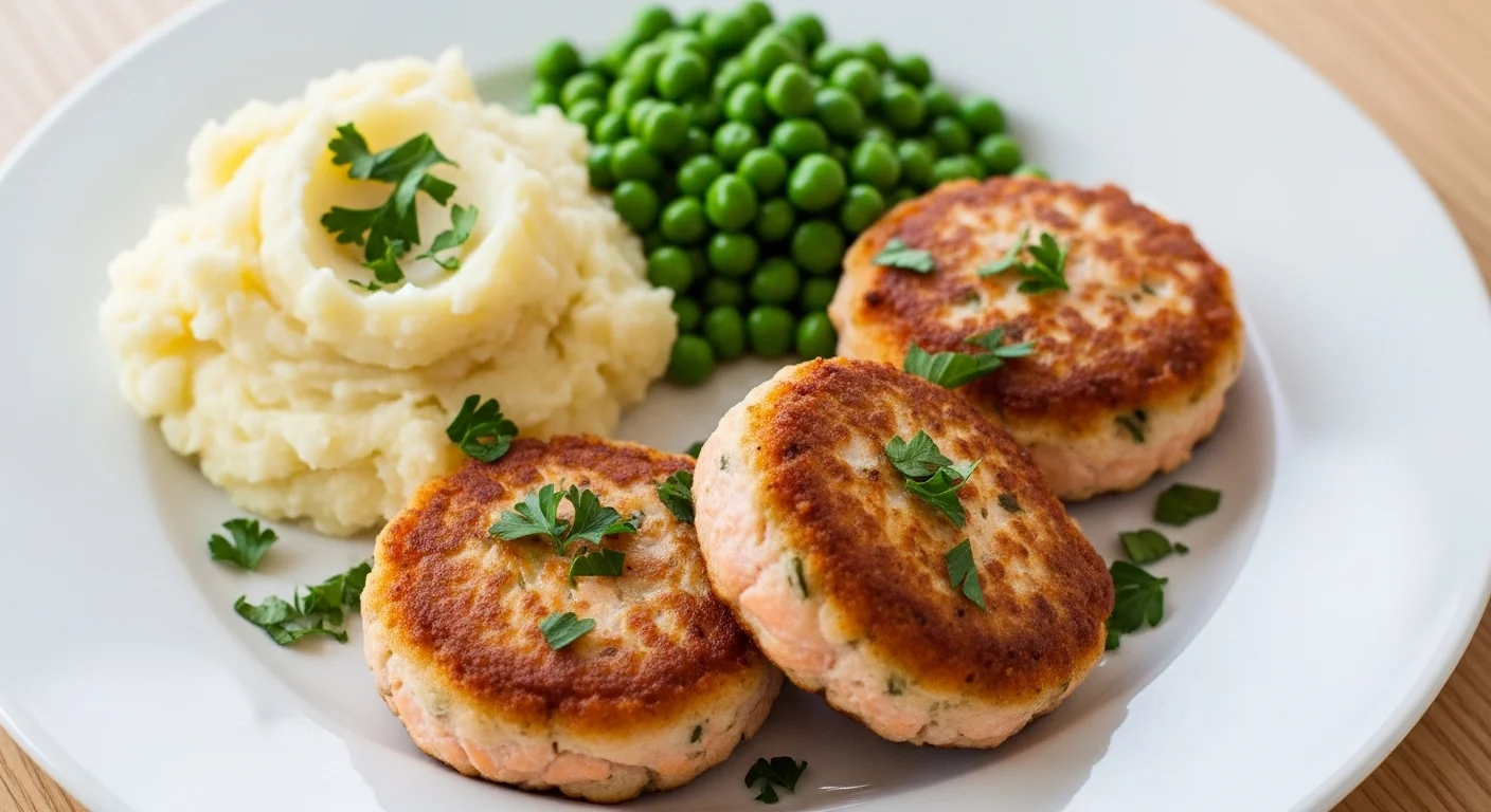 A plate of crispy, golden-brown salmon patties served with mashed potatoes and green peas, garnished with fresh herbs—perfect for an Old Fashioned Salmon Patties Recipe.