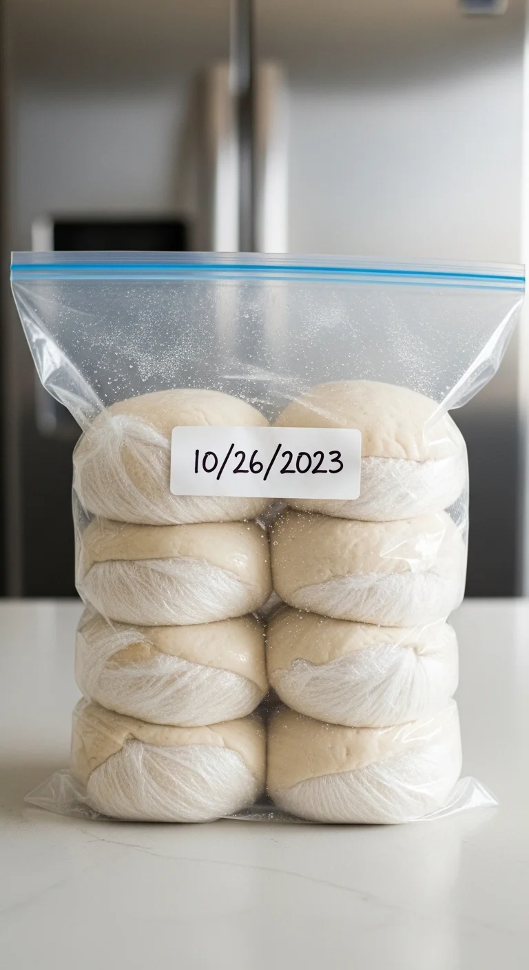 Portion the dough after the first rise. Wrap each ball tightly in plastic wrap, then place in a freezer-safe bag. Label with the date. Dough keeps for up to three months. To use, thaw overnight in the refrigerator, then bring to room temperature for two hours before shaping.