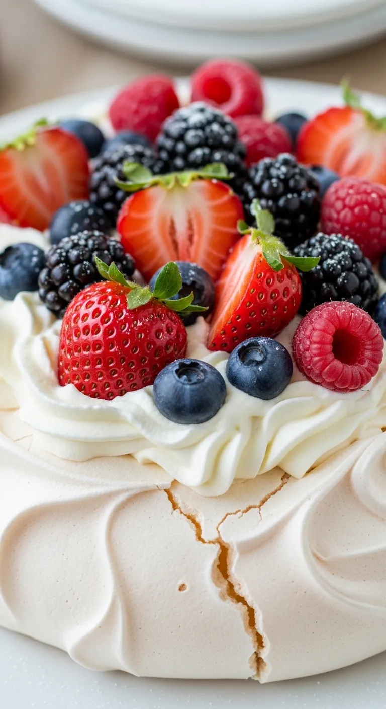 Crisp meringue topped with whipped cream and fresh berries.