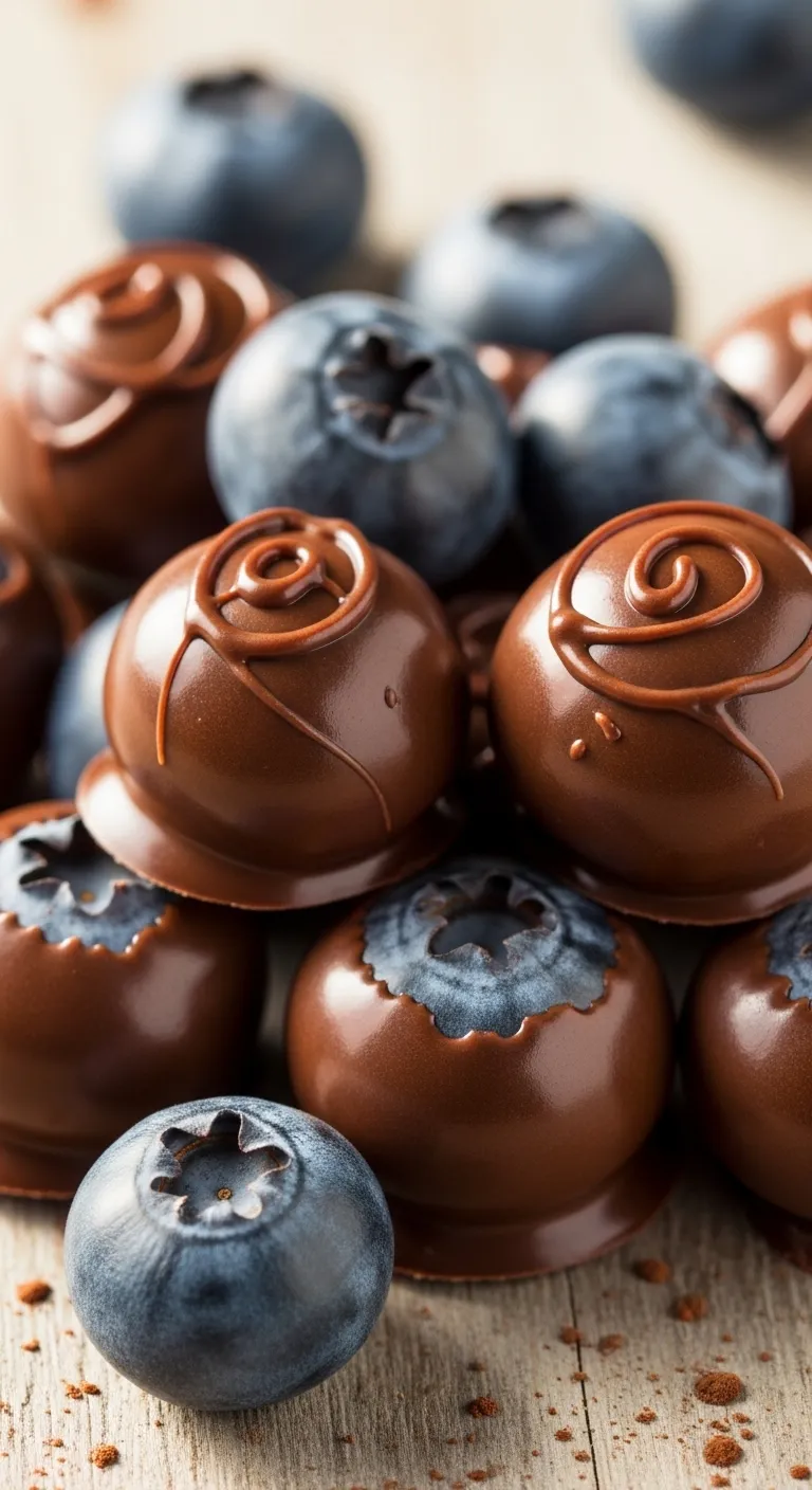 Small sweet treats made by dipping blueberries in melted chocolate.