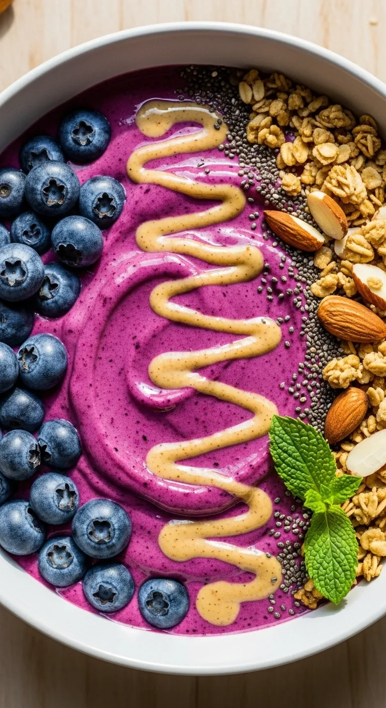 Blend blueberries with yogurt and banana for a creamy breakfast bowl.