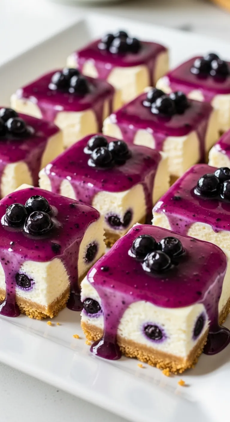 Creamy cheesecake layered with a vibrant blueberry topping.