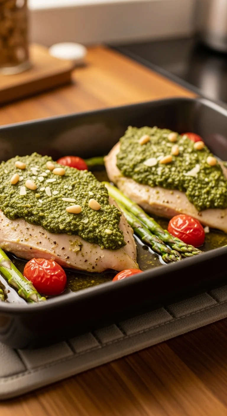 Spread pesto over chicken and bake. Minimal prep with strong flavor.