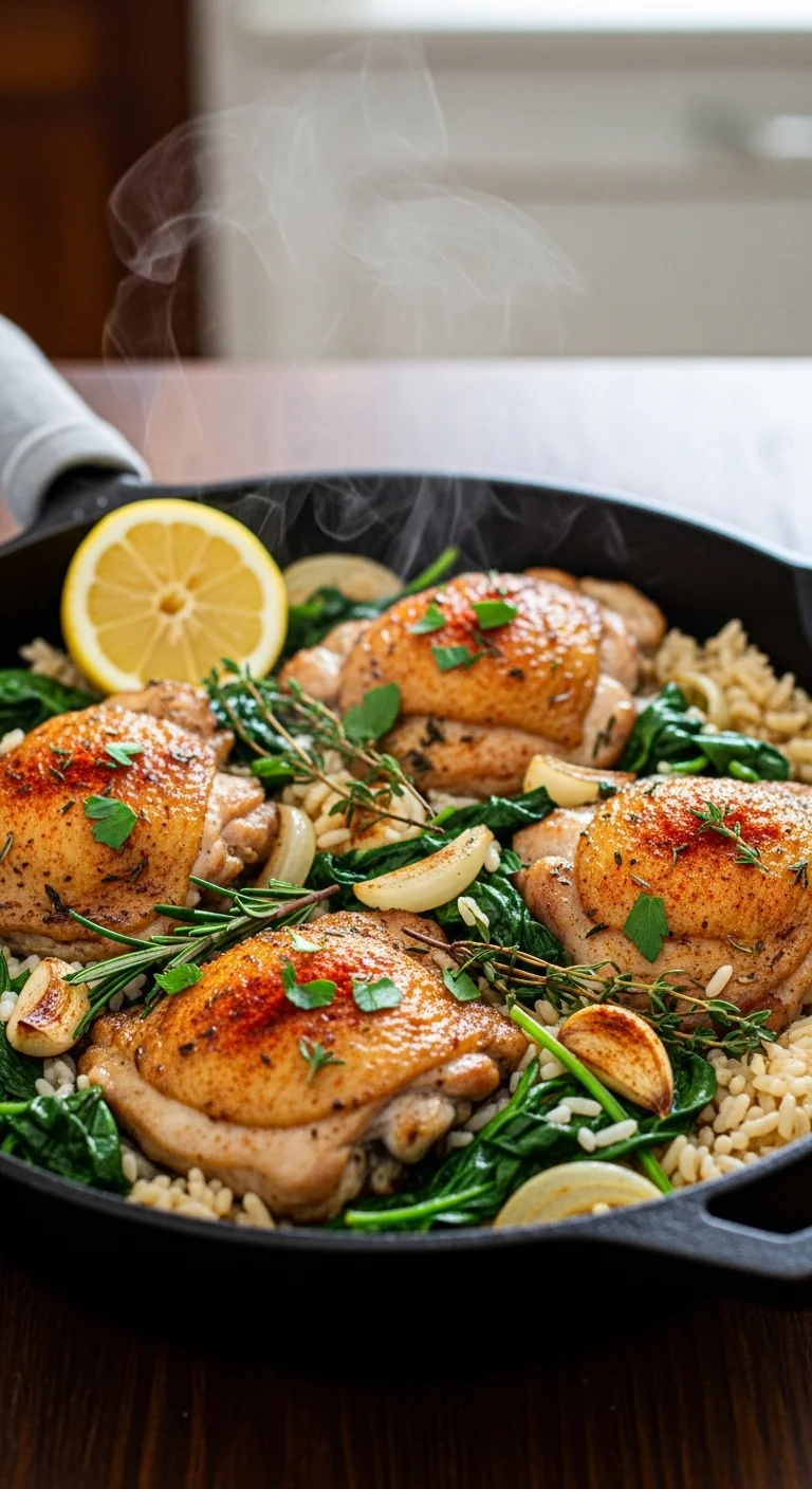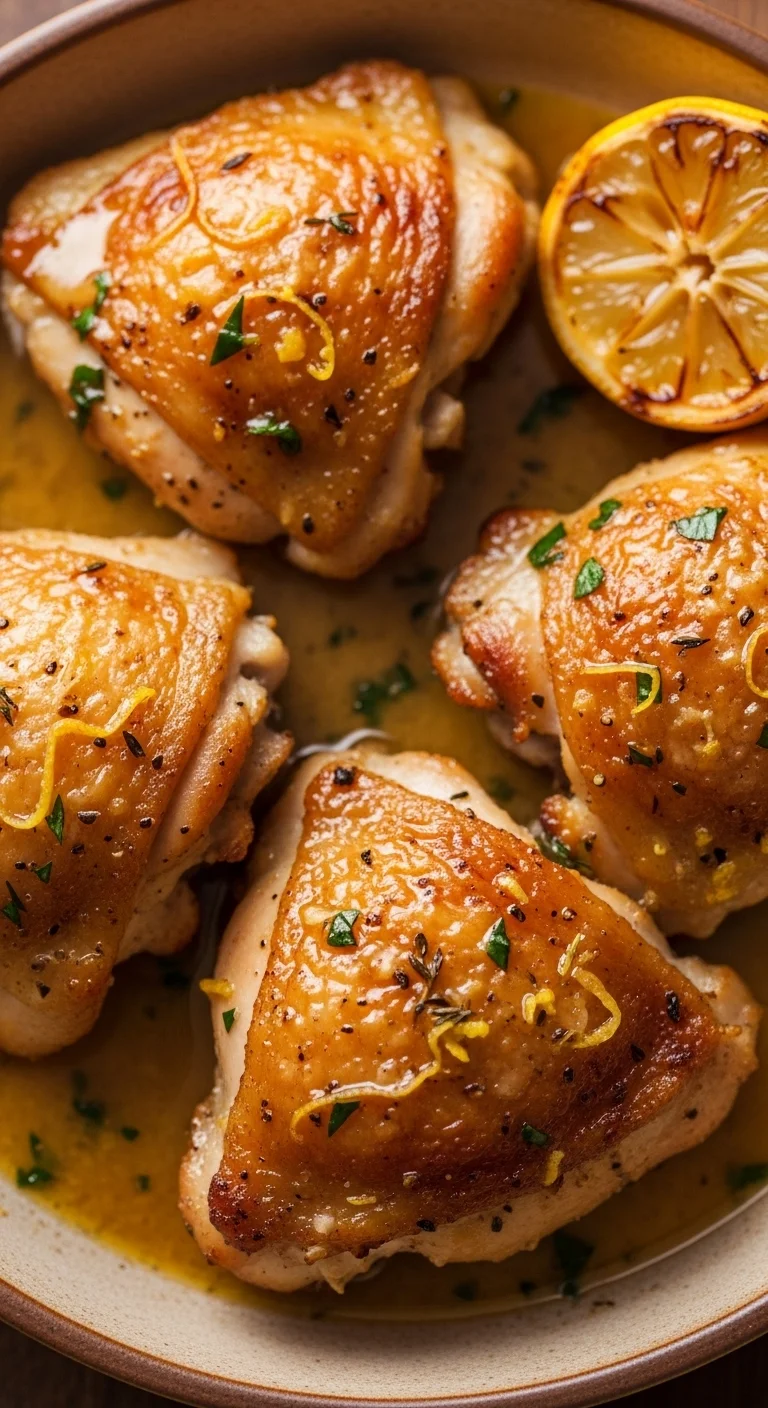 Pan-seared thighs finished with butter and lemon feel rich but balanced. Use a lid briefly to lock in moisture. Serve with bread or rice to soak up the sauce.