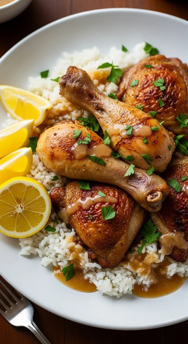 Pan-cooked chicken served over rice with lemon juice feels comforting and light. Add vegetables if available.