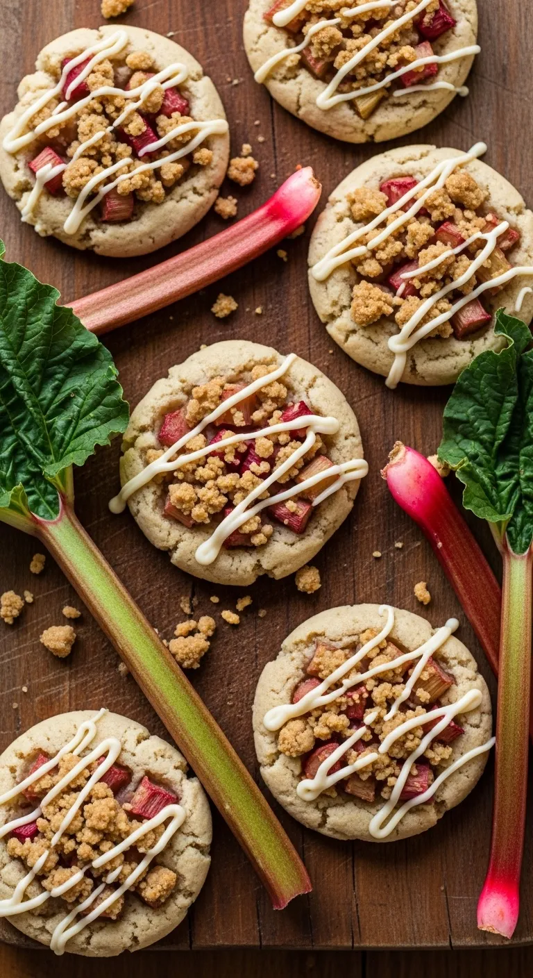 Rhubarb shines in these unique spring cookies. For the streusel, mix half cup of flour, quarter cup of brown sugar, and three tablespoons of cold butter cut in until crumbly. Set aside.