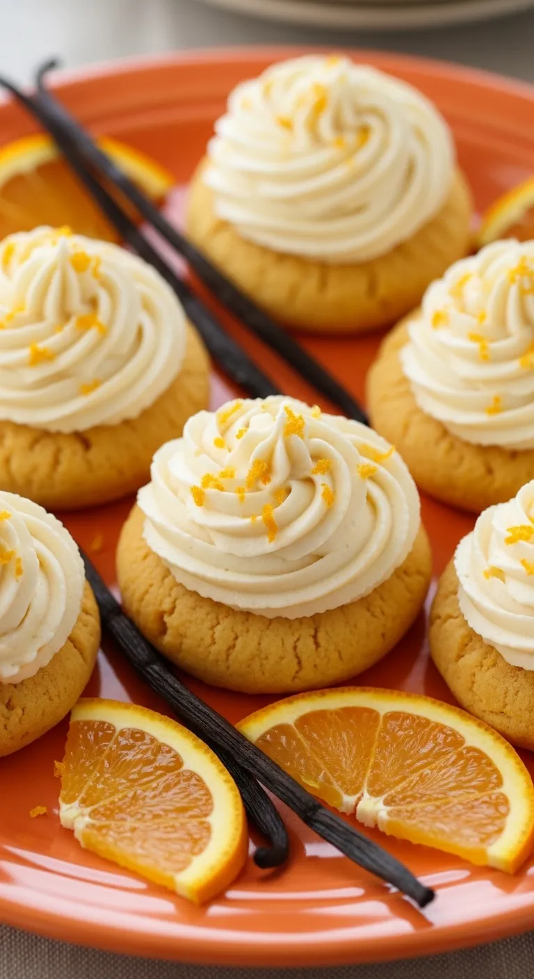 For the frosting, beat half cup of softened butter with two cups of powdered sugar, two tablespoons of milk, and a teaspoon of vanilla. Spread or pipe onto cooled cookies. Sprinkle with orange zest.