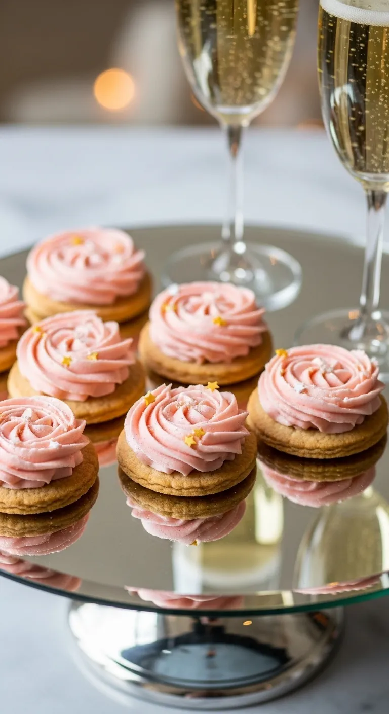 For the frosting, beat half cup of softened butter with two cups of powdered sugar and two tablespoons of champagne until light and fluffy. Pipe onto cooled cookies. Top with edible gold stars.