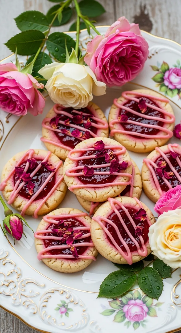 Bake at 350°F for 12 to 14 minutes until edges are golden. Cool completely. Drizzle with glaze made from powdered sugar, milk, and a drop of rose water. Sprinkle with dried rose petals.
