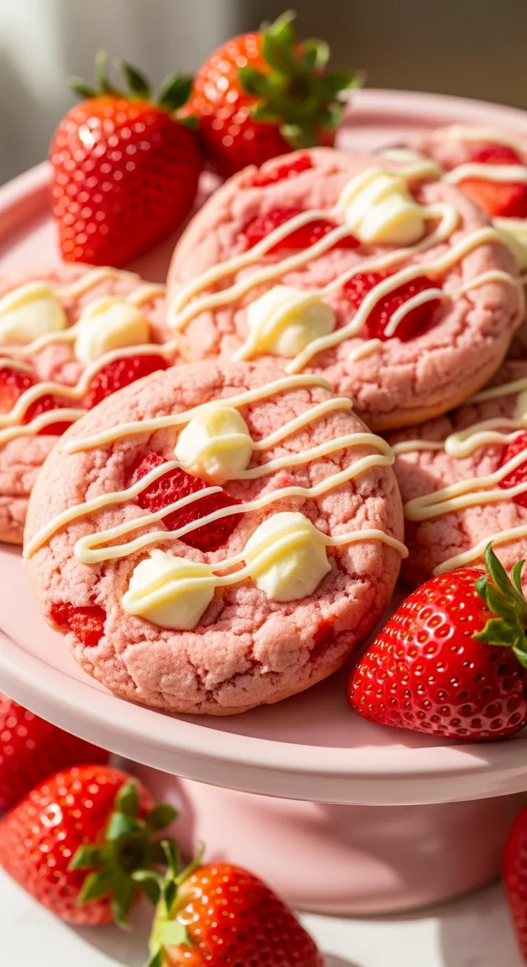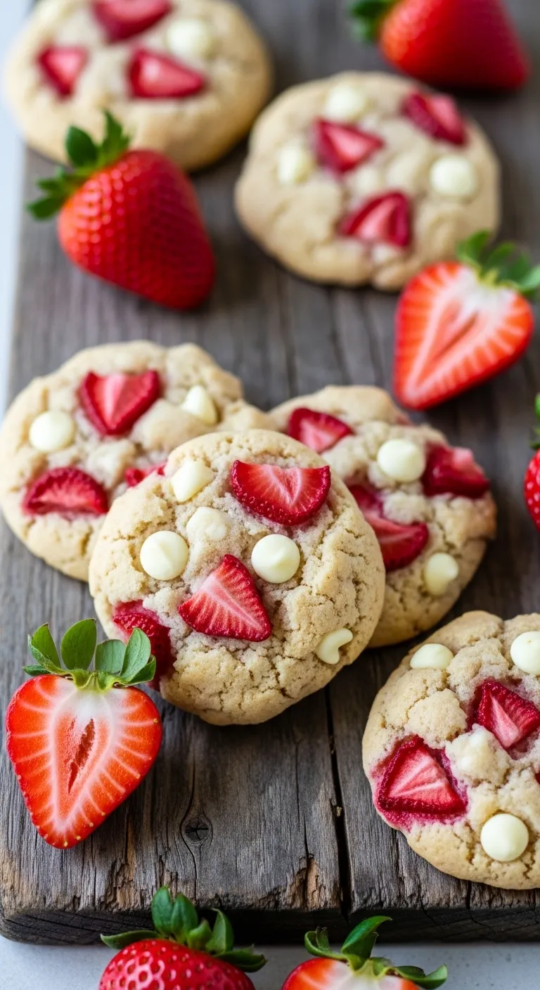 Gently fold in the floured strawberries and half cup of white chocolate chips. Drop rounded tablespoons onto parchment-lined sheets. Bake at 375°F for 12 to 14 minutes until edges are golden but centers remain soft.