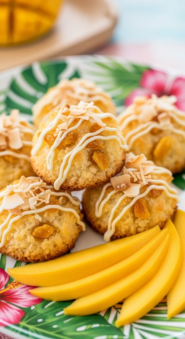 These chewy macaroons are incredibly easy. In a large bowl, whisk four egg whites with half cup of sugar until frothy. Stir in three cups of shredded coconut, half cup of finely chopped dried mango, a teaspoon of vanilla, and a quarter teaspoon of salt.