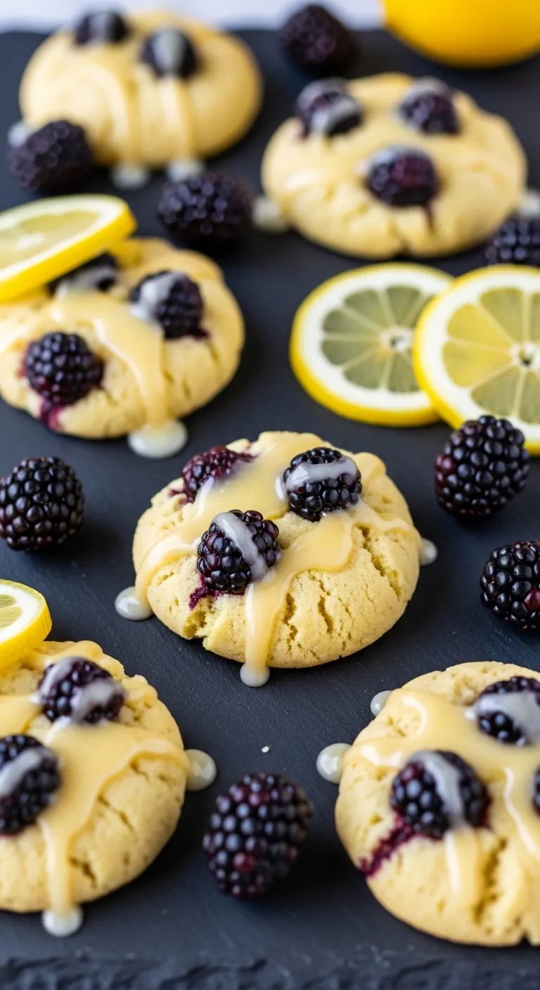 These cookies showcase the beautiful contrast of deep purple blackberries against bright lemon. Cream half cup of softened butter with one cup of sugar until light. Add one egg, the zest of two lemons, and two tablespoons of lemon juice.