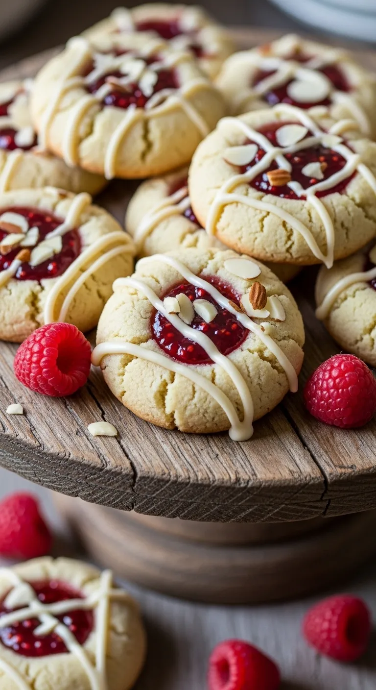 Roll into one-inch balls, then roll in sliced almonds to coat. Place on parchment-lined sheets and make an indentation in each with your thumb or a measuring teaspoon. Fill each with about half teaspoon of raspberry jam.