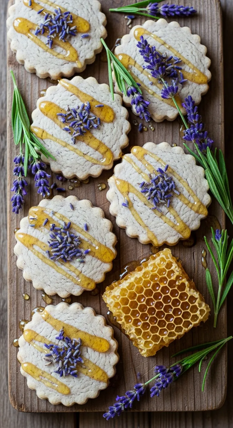 These sophisticated cookies taste like a spring garden. Beat one cup of softened butter with half cup of honey until creamy—honey makes them softer than sugar-based shortbread. Add one teaspoon of vanilla.