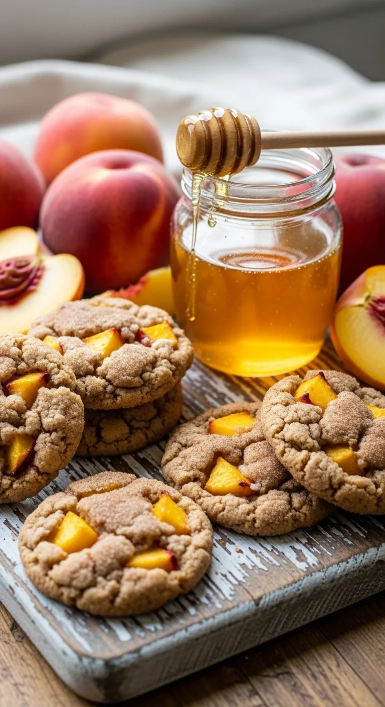 These cookies capture all the comfort of peach cobbler. Dice one cup of fresh or canned peaches (well-drained) into small pieces. Toss with a tablespoon of flour to coat.