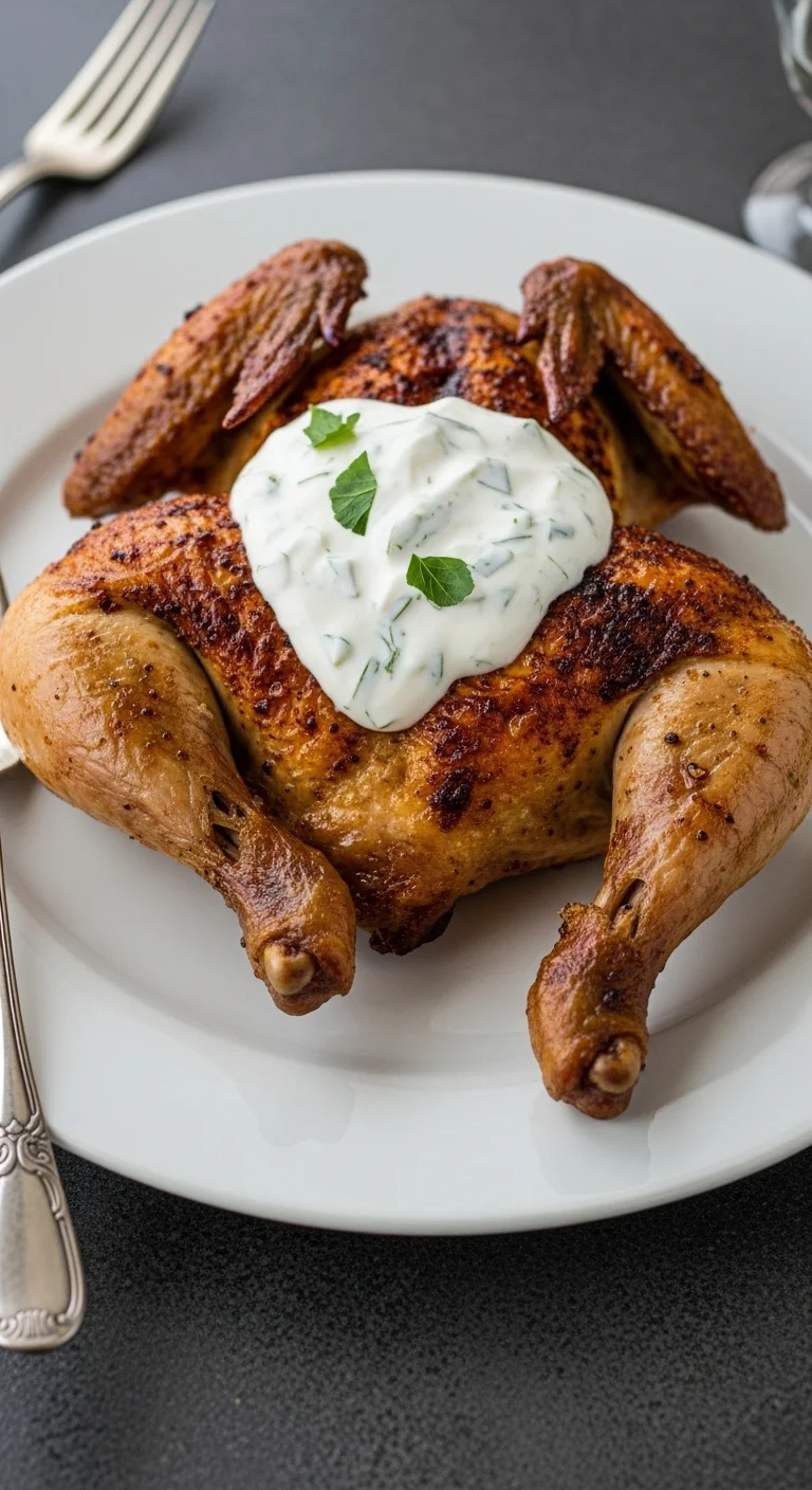 Bake chicken with simple spices. Serve with a yogurt-based sauce for brightness. Keeps the dish balanced.