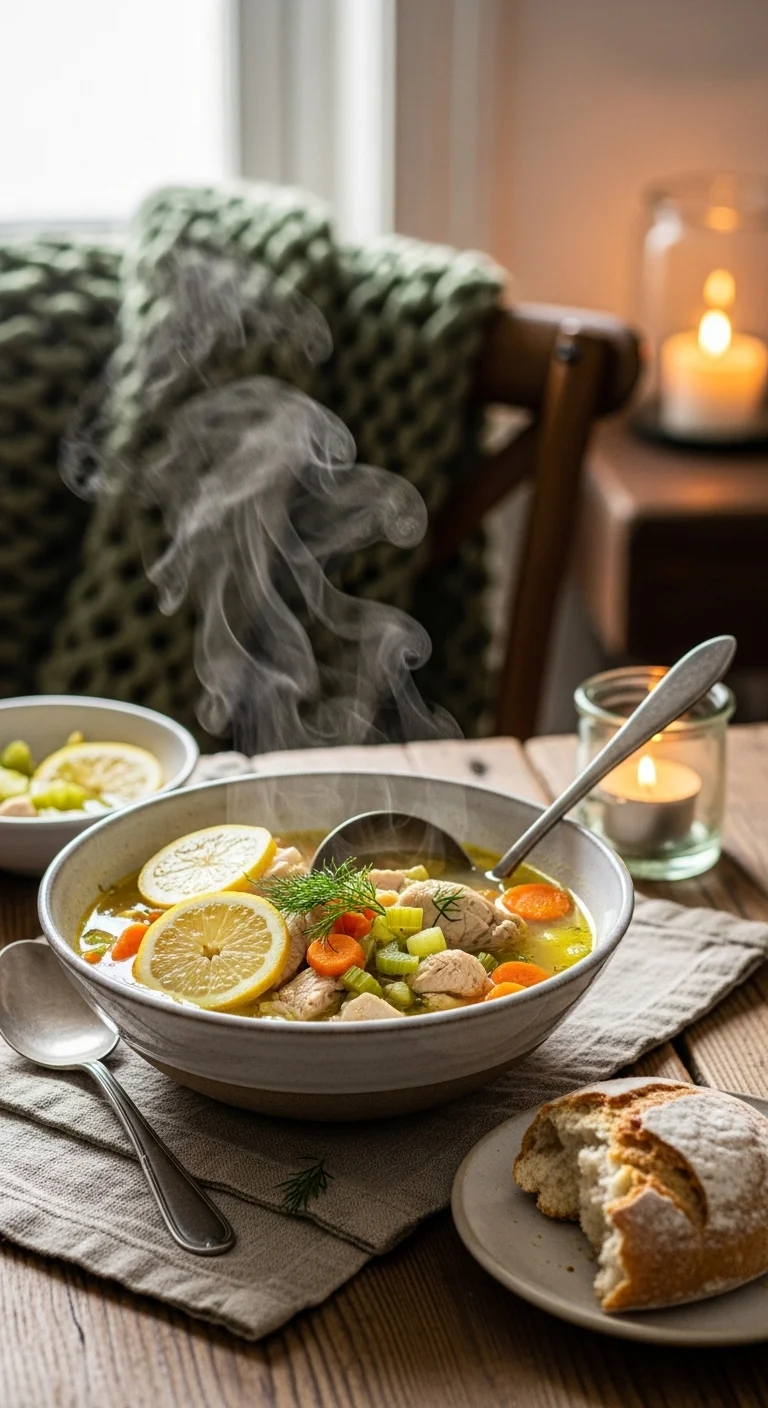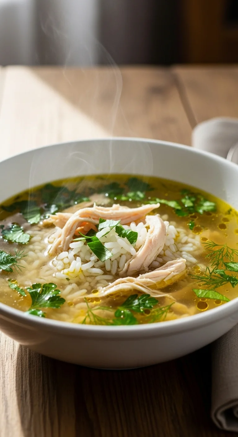 This soup stays gentle and soothing. Use broth, rice, chicken, and herbs. Good for slow evenings.