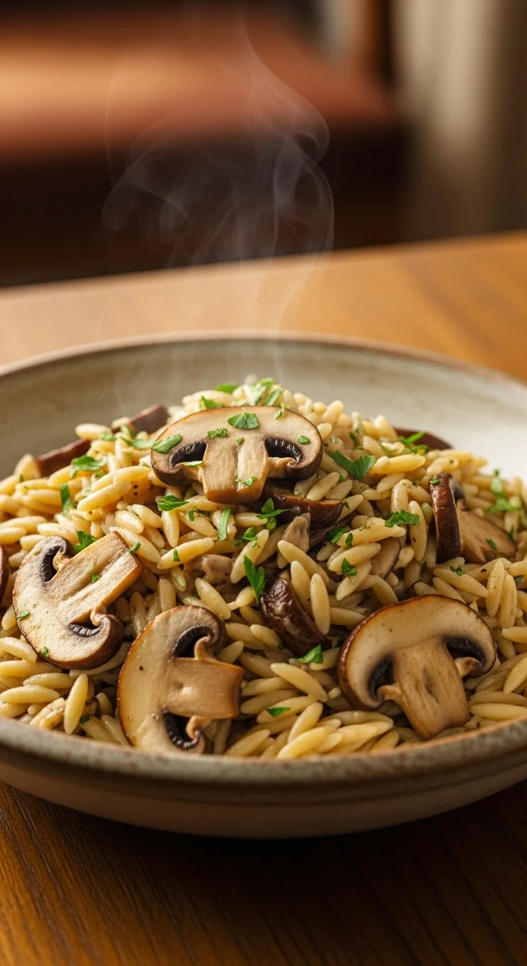 Orzo cooks quickly and feels comforting. Simmer with mushrooms, garlic, broth, and a small splash of cream. Finish with cheese.