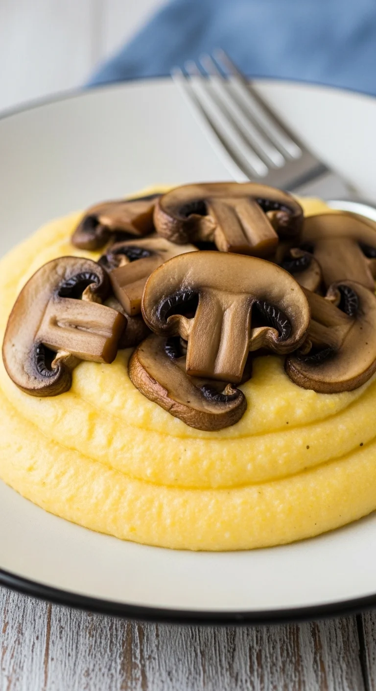 Polenta feels soothing and light. Use broth instead of heavy cream. Top with mushrooms for depth.