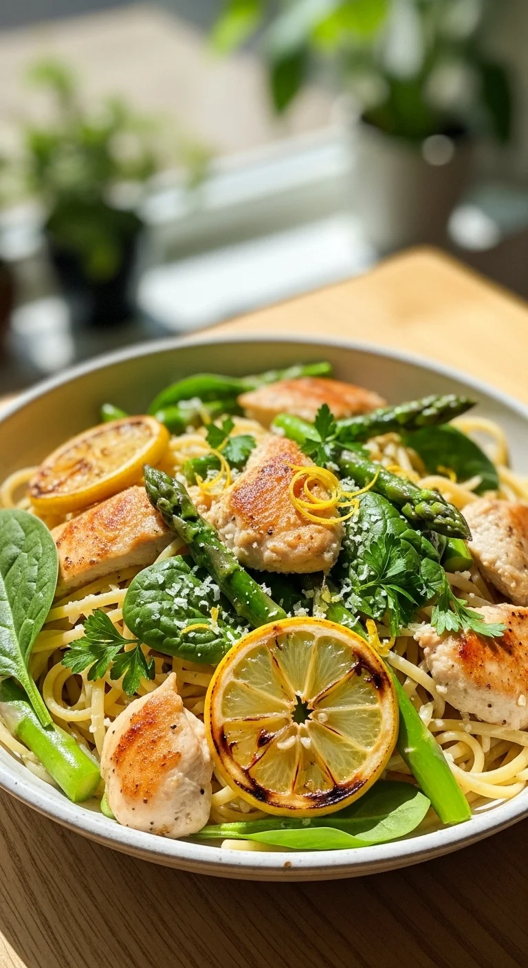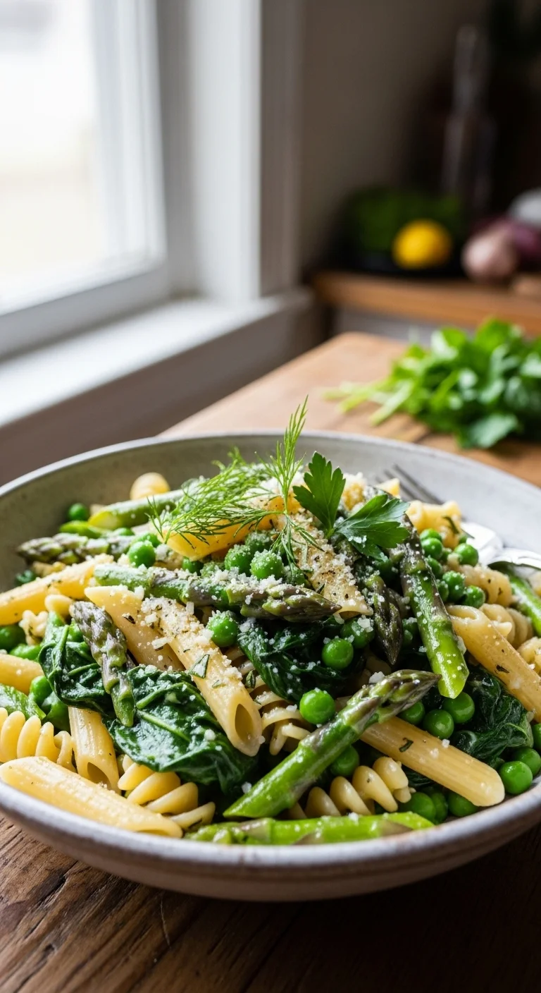 This pasta uses seasonal vegetables and a light sauce. Sauté asparagus and peas until tender. Add cooked pasta, a splash of pasta water, and a small amount of cream or ricotta. Finish with lemon juice and cheese. It feels cozy without weighing you down. Use any pasta shape you already have.