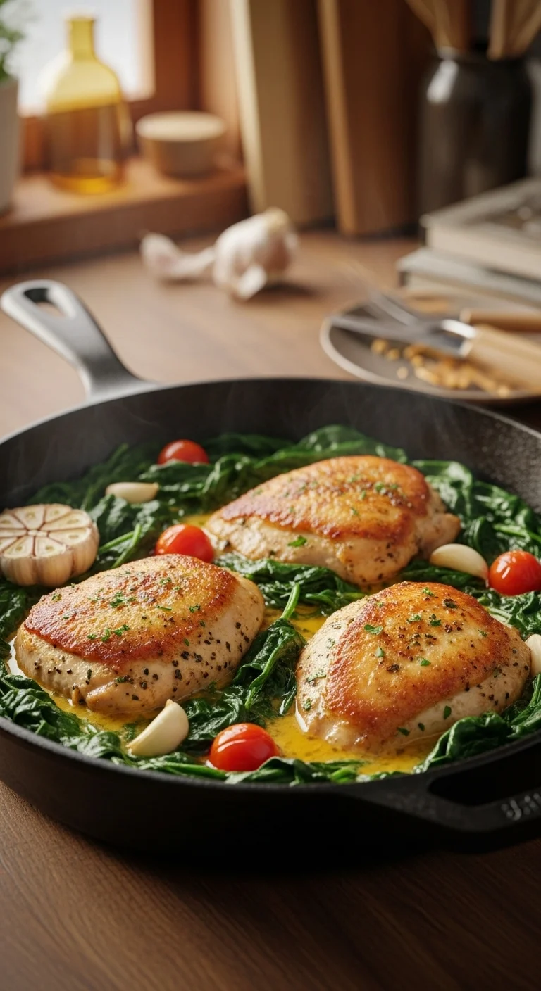 Sauté chicken with garlic and olive oil. Add broth and a small splash of cream. Stir in spinach until just wilted. Serve over rice or pasta. The sauce stays light but comforting.