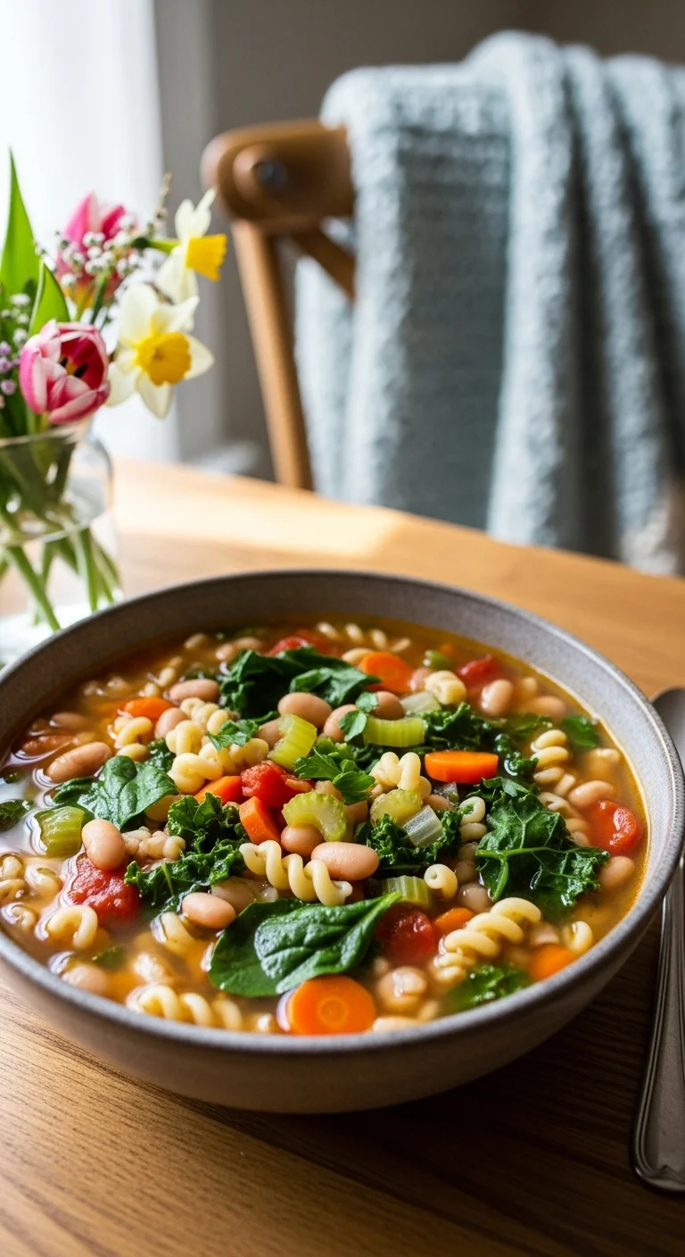 This soup uses lighter vegetables like zucchini, carrots, and greens. Simmer in broth until tender. Add beans and small pasta. It warms without feeling heavy and freezes well.