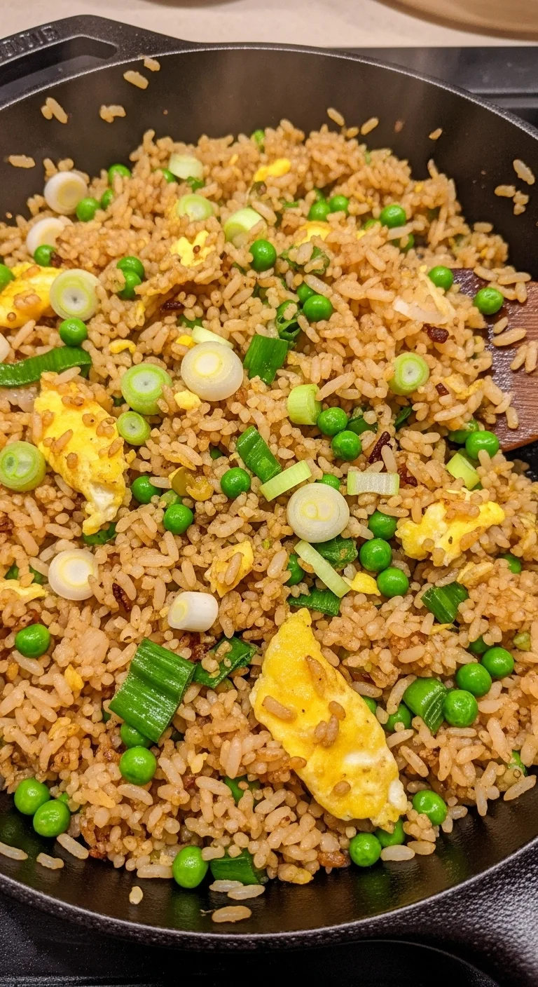 Use leftover rice to save time. Add eggs, peas, and green onions. Season lightly. This dish stretches ingredients and feeds a crowd.