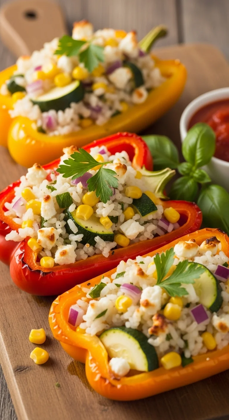 Fill peppers with rice, vegetables, and a bit of cheese. Bake until tender. These reheat well and store easily.