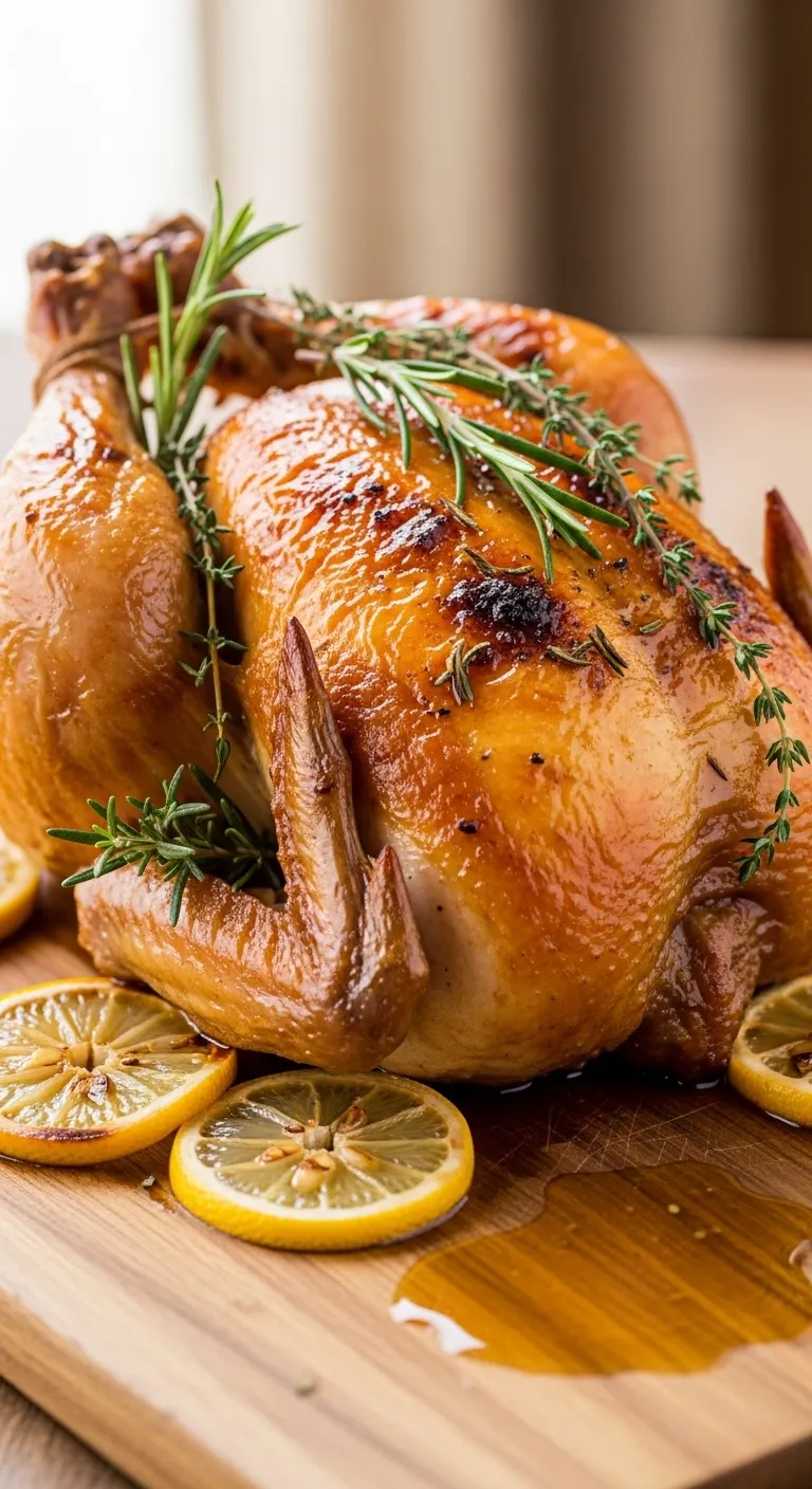 Roast chicken with lemon wedges, garlic, and herbs. The citrus keeps the meat tender and aromatic.