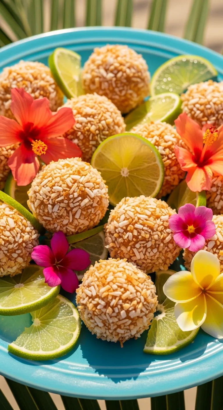 These tropical bites transport you to the beach with one taste. In a food processor, combine one cup of pitted dates, one cup of unsweetened shredded coconut, the zest of two limes, two tablespoons of lime juice, and a pinch of salt.
