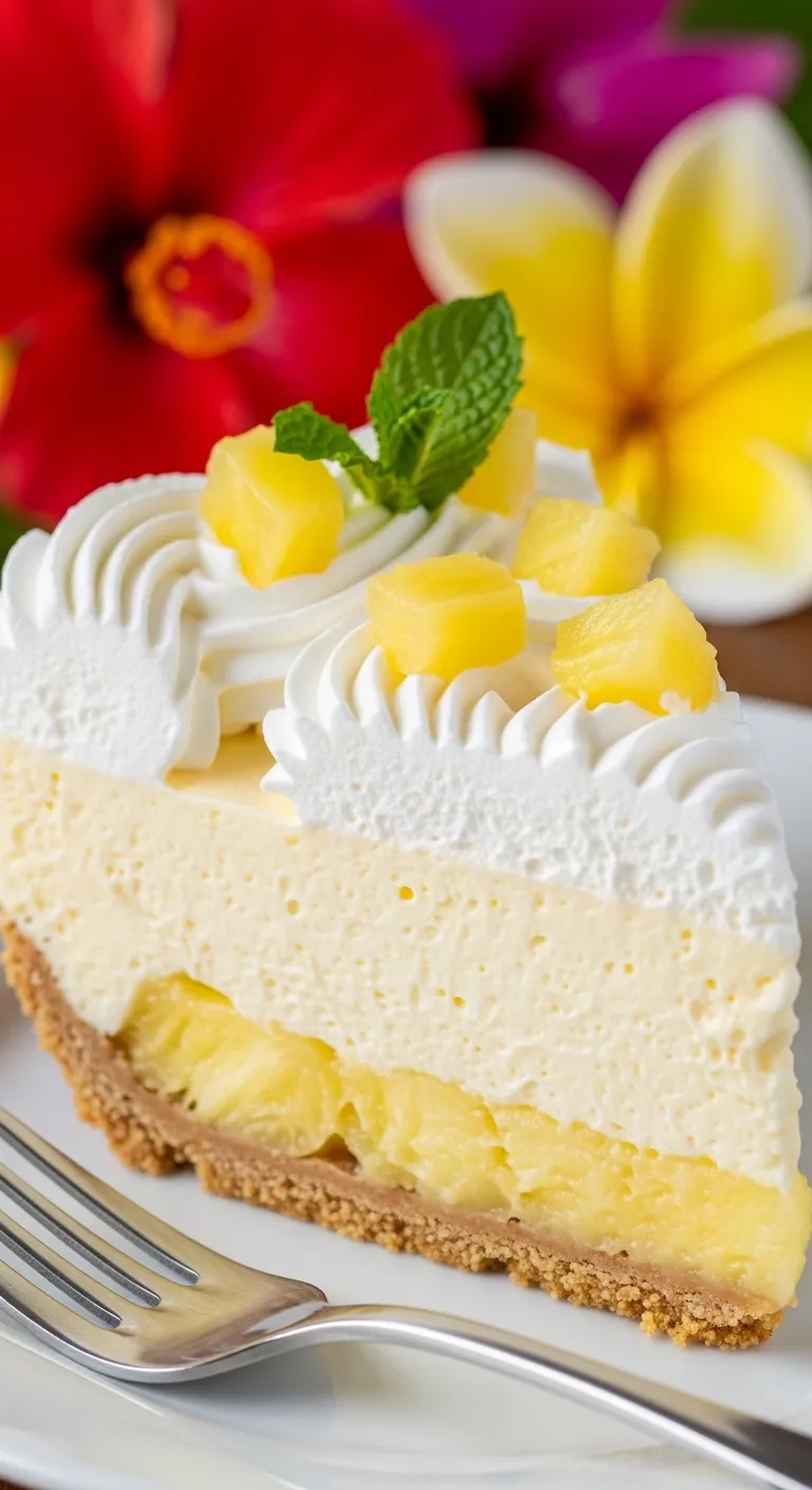 In another bowl, whip one cup of heavy cream to stiff peaks. Fold into the pineapple mixture gently. Pour into the crust and smooth the top.