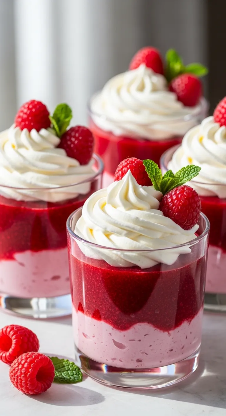 In clear glasses, layer whipped cream and raspberry puree. Use a skewer to gently swirl the layers together for a marbled effect. Don’t overmix—you want distinct ribbons of color.