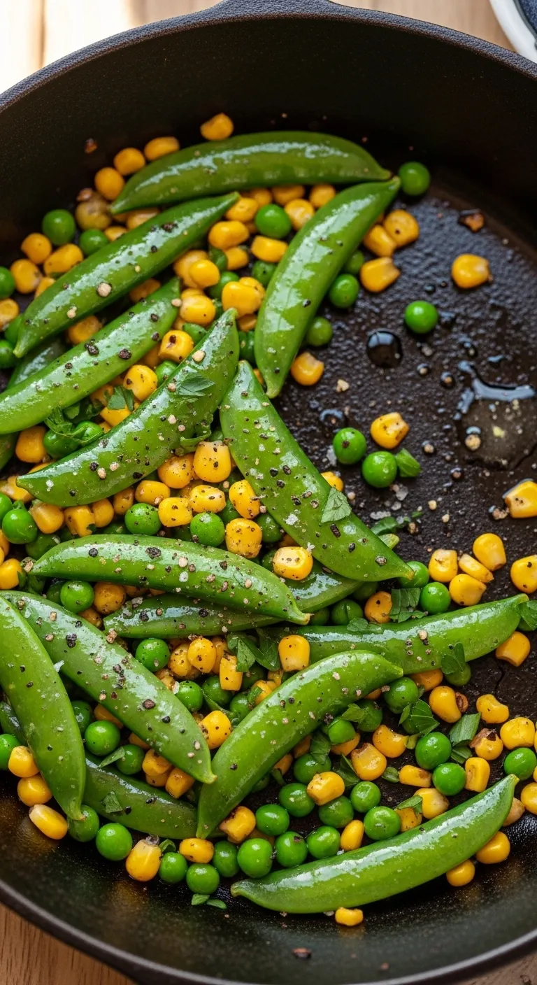 [Image Prompt: Peas and carrots sautéed in a skillet.]