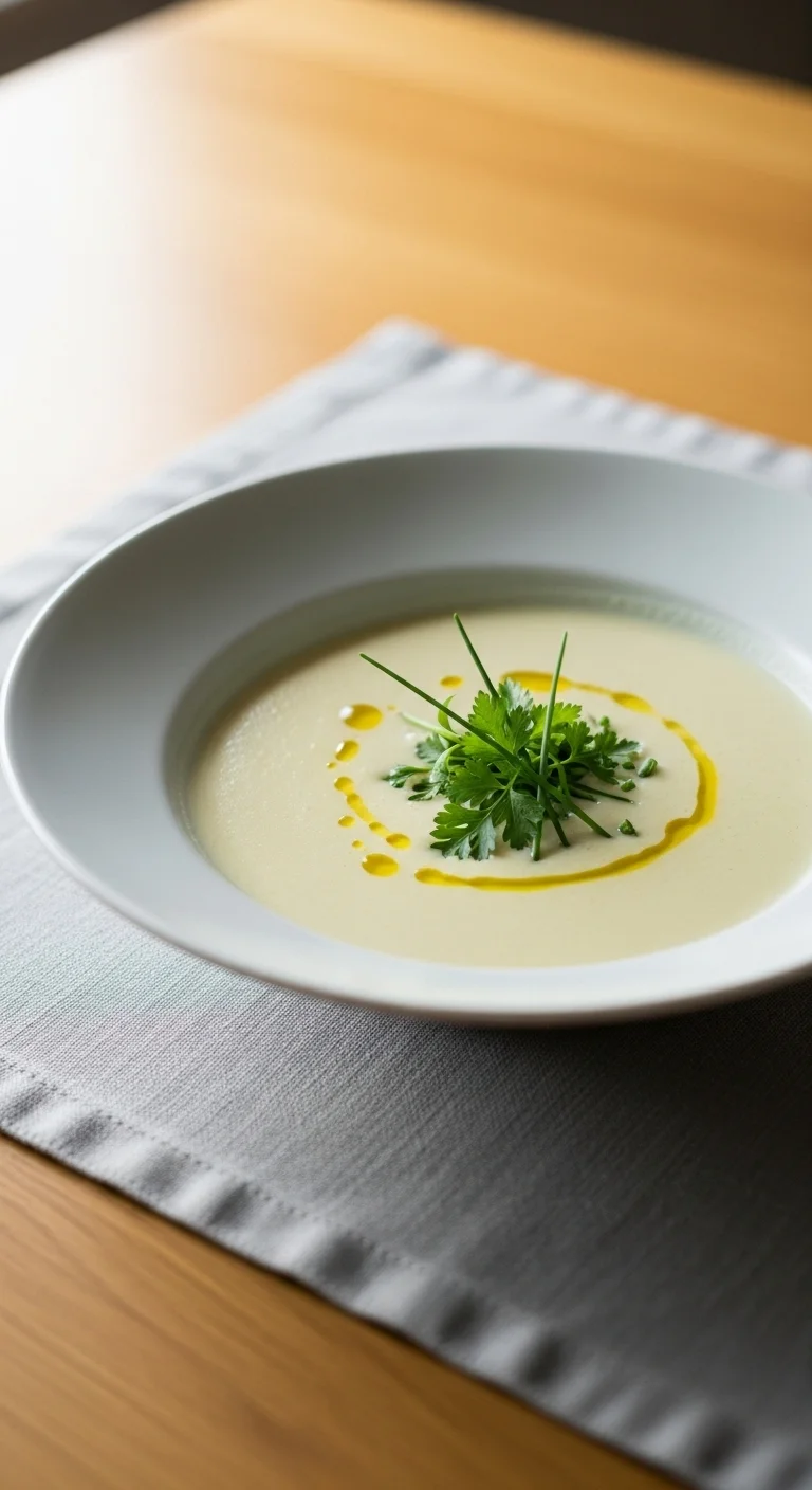Cauliflower blends into a smooth base with broth and a splash of cream. Mild and cozy without heaviness.
