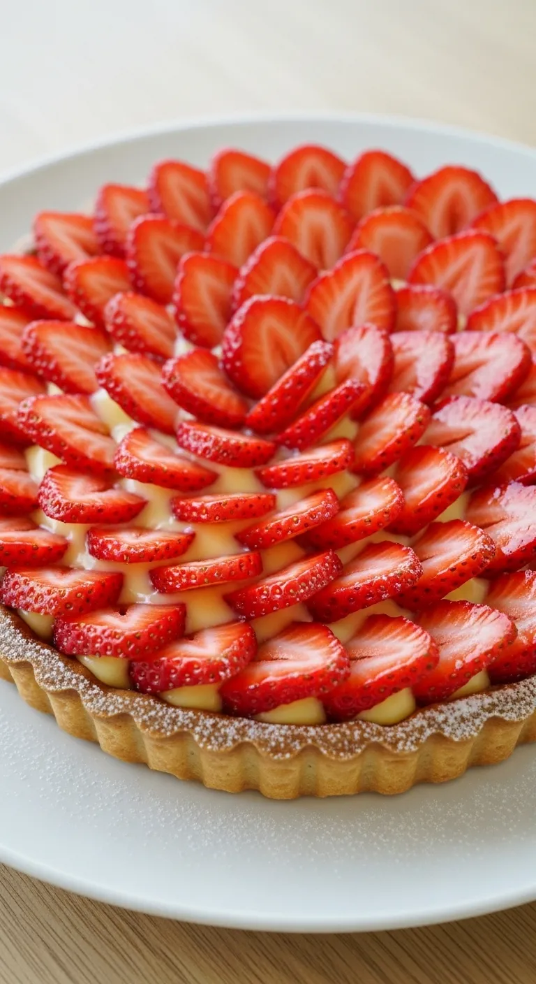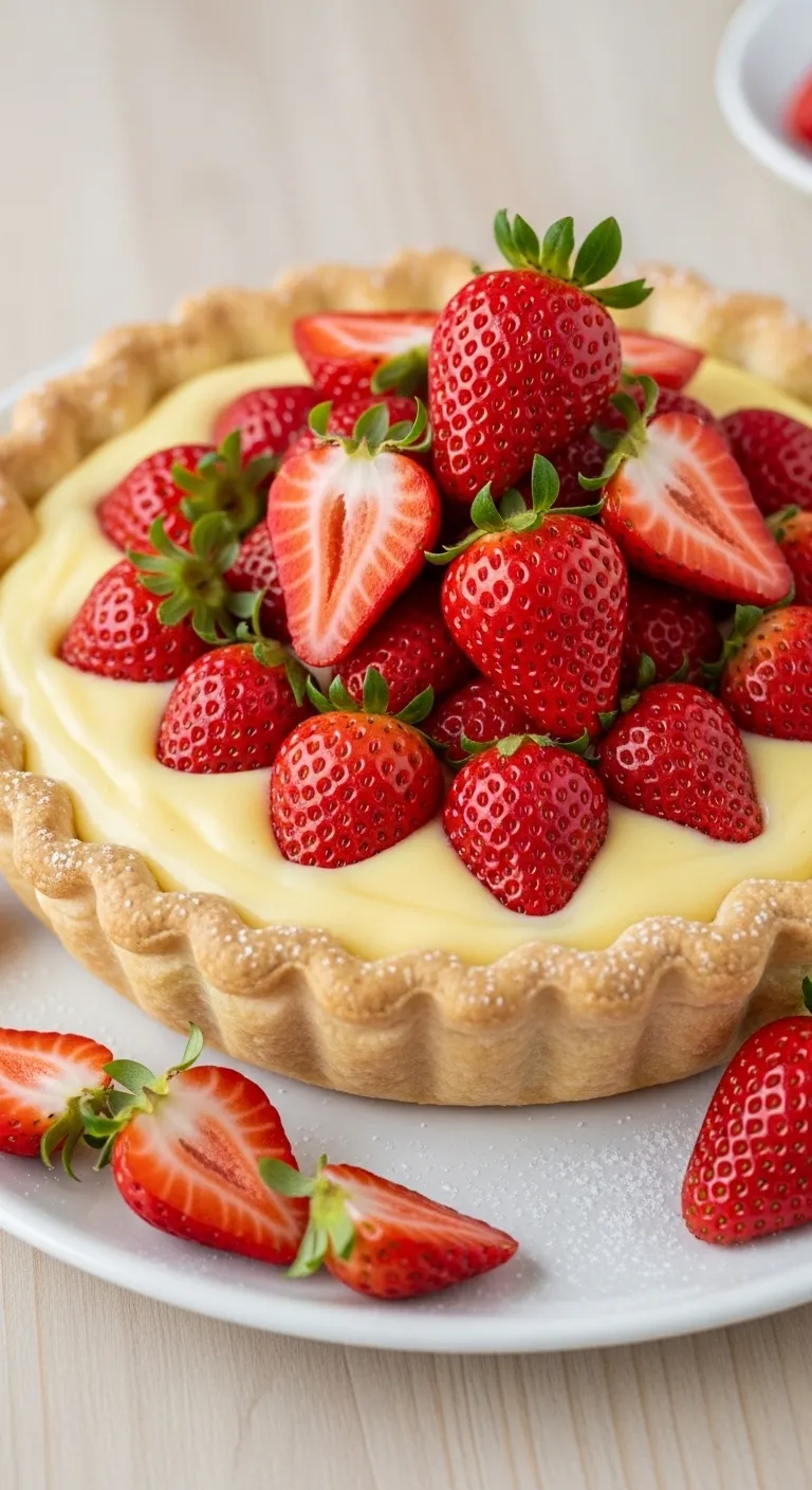 A crisp pastry crust filled with creamy custard and glossy strawberries.