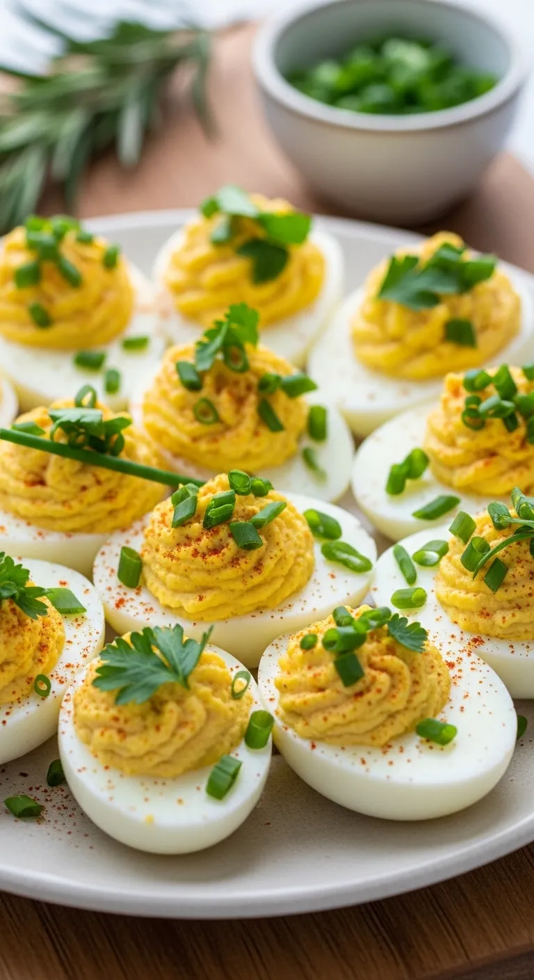 Classic deviled eggs topped with chopped chives or parsley for festive color.