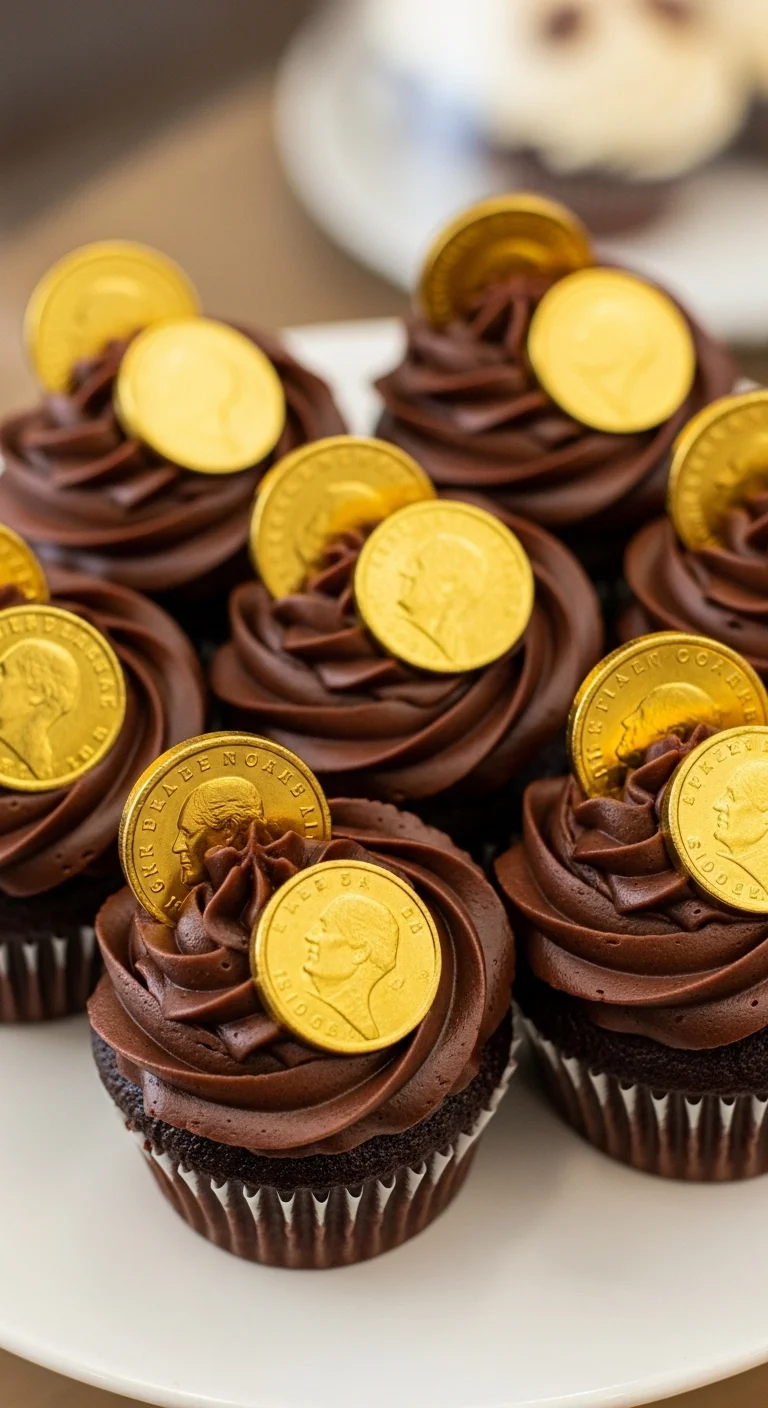Chocolate cupcakes topped with gold accents feel festive without extra effort. Candy coins or yellow sprinkles do the job fast.