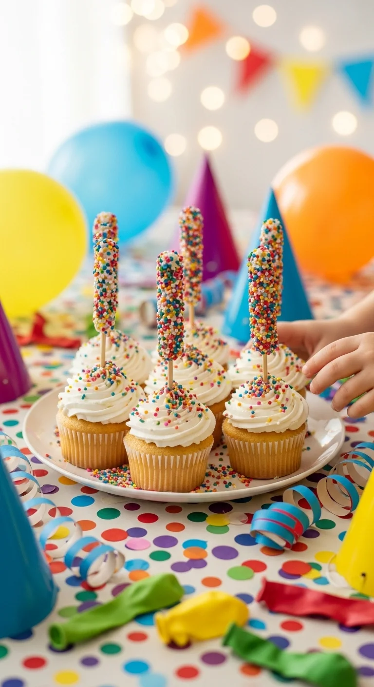 Frost cupcakes simply and cover with sprinkles. No piping skills required. Bright colors carry the theme instantly and make these easy for large groups.