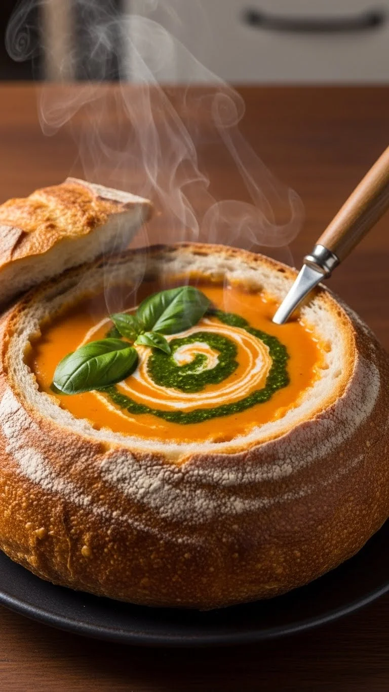 Warm tomato soup, pour into the bread bowl, and top with a little basil. Simple, cozy, and perfect for dipping the edges.