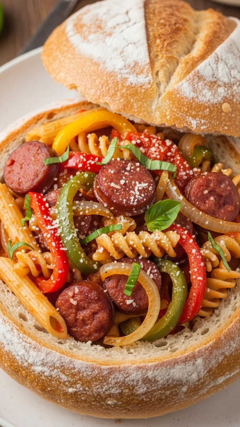 Cook sausage with peppers, mix with pasta and sauce, and serve inside the bowl.