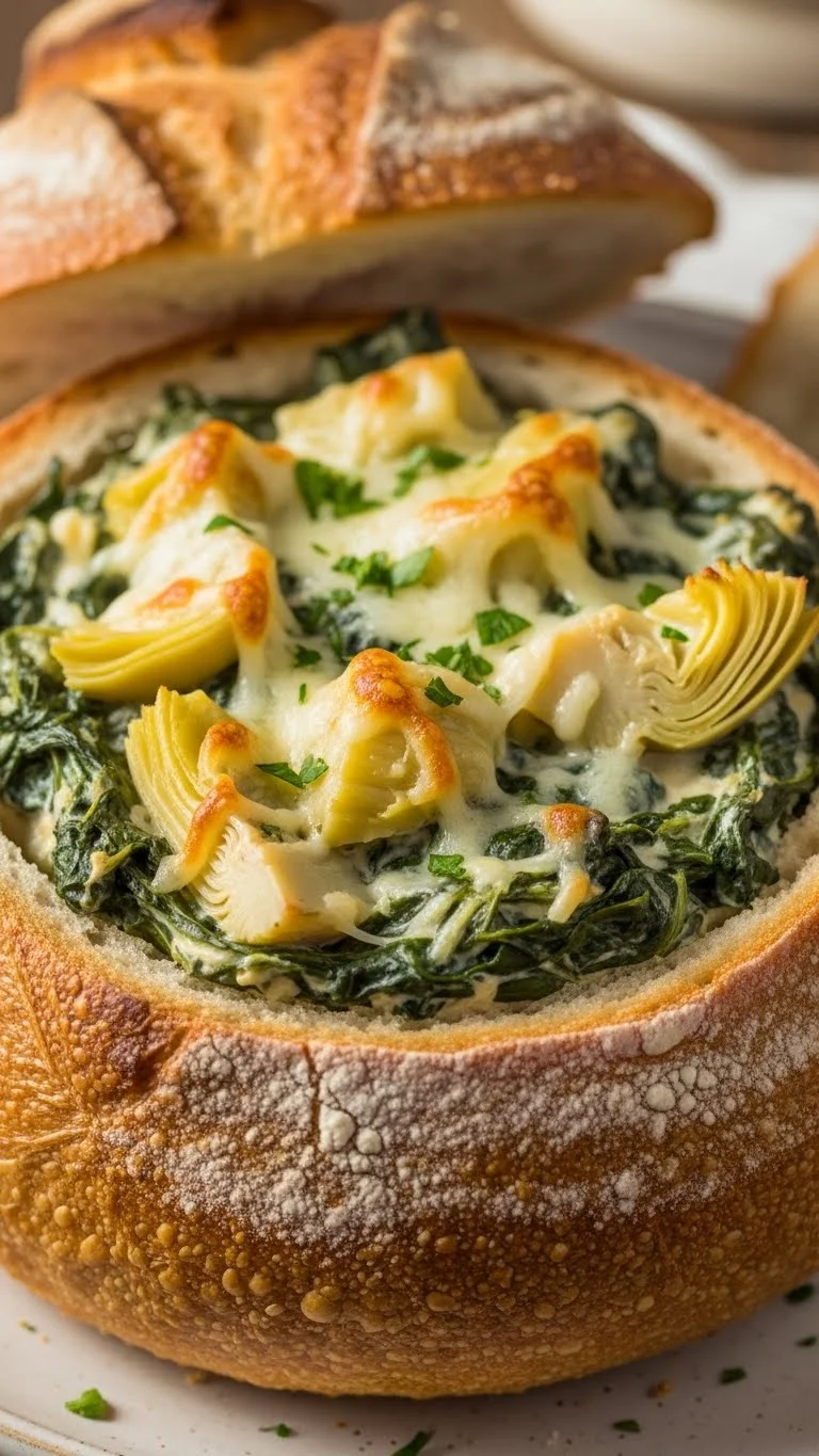 Warm spinach dip works perfectly as a thick, flavorful bread bowl meal—great for sharing.